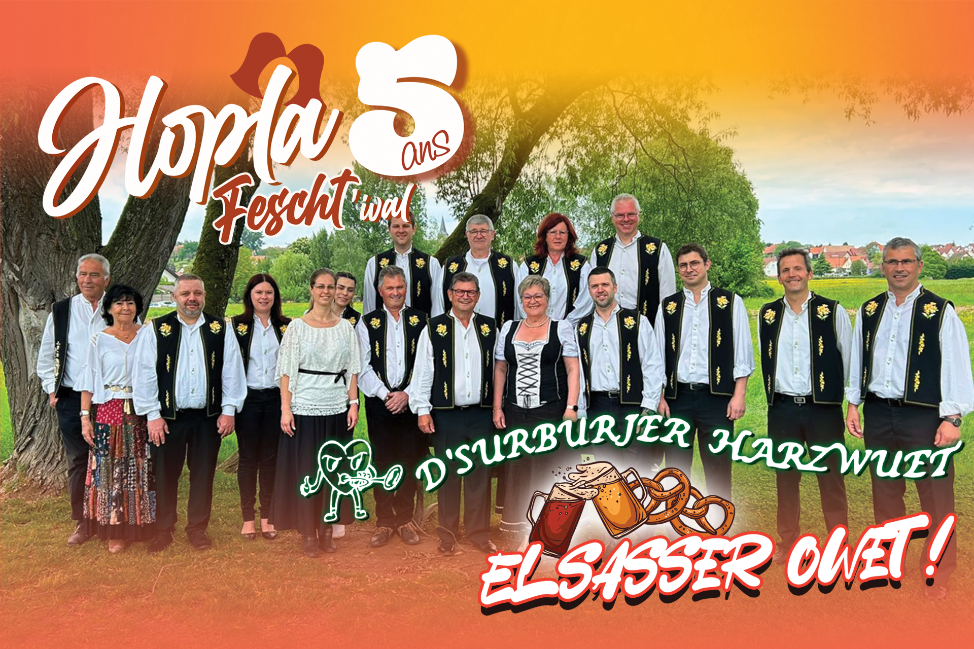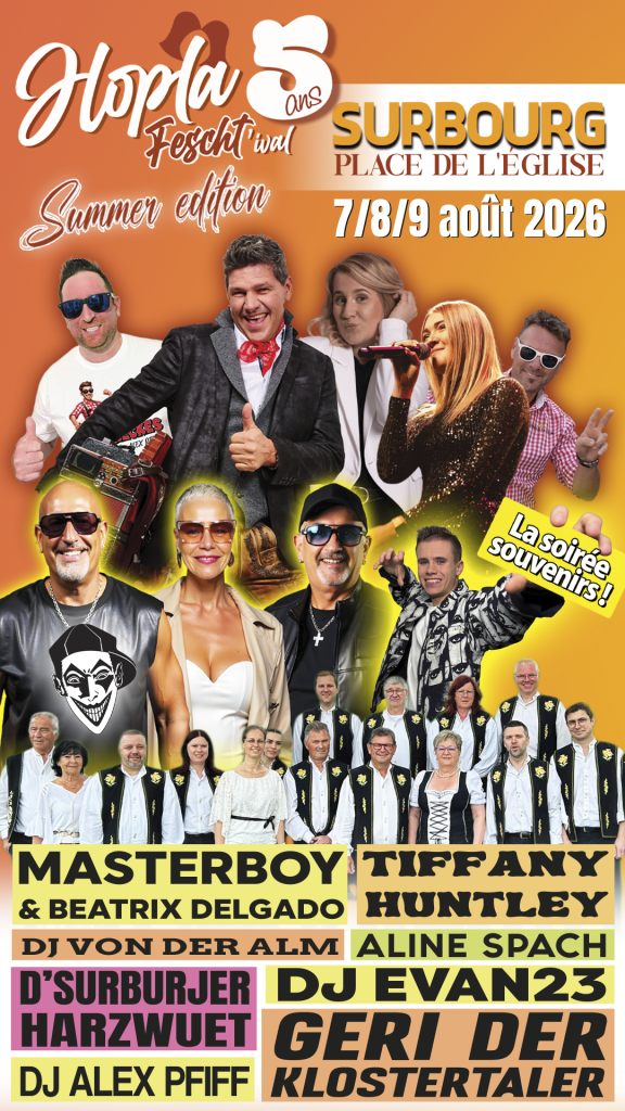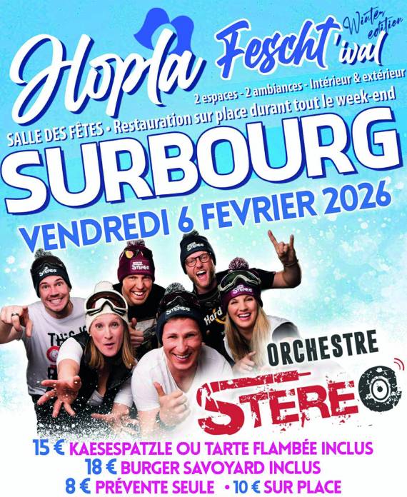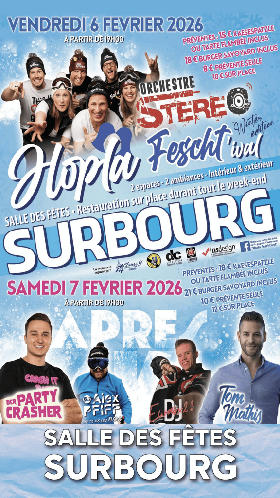 Hopla Fescht’ival, festival rural situé à Surbourg, dans le Bas-Rhin, a été créé en 2022 grâce à l’idée originale de Yann Clauss et Steve Ruhf, avec le soutien de l’Union Sportive de Surbourg. Depuis, l’événement attire de nombreux visiteurs, avec deux éditions annuelles : une édition hivernale en février, sous le thème des chaleureuses soirées après-ski, et une édition estivale en plein air, au cœur du village, dans le décor majestueux d’une abbatiale presque millénaire.